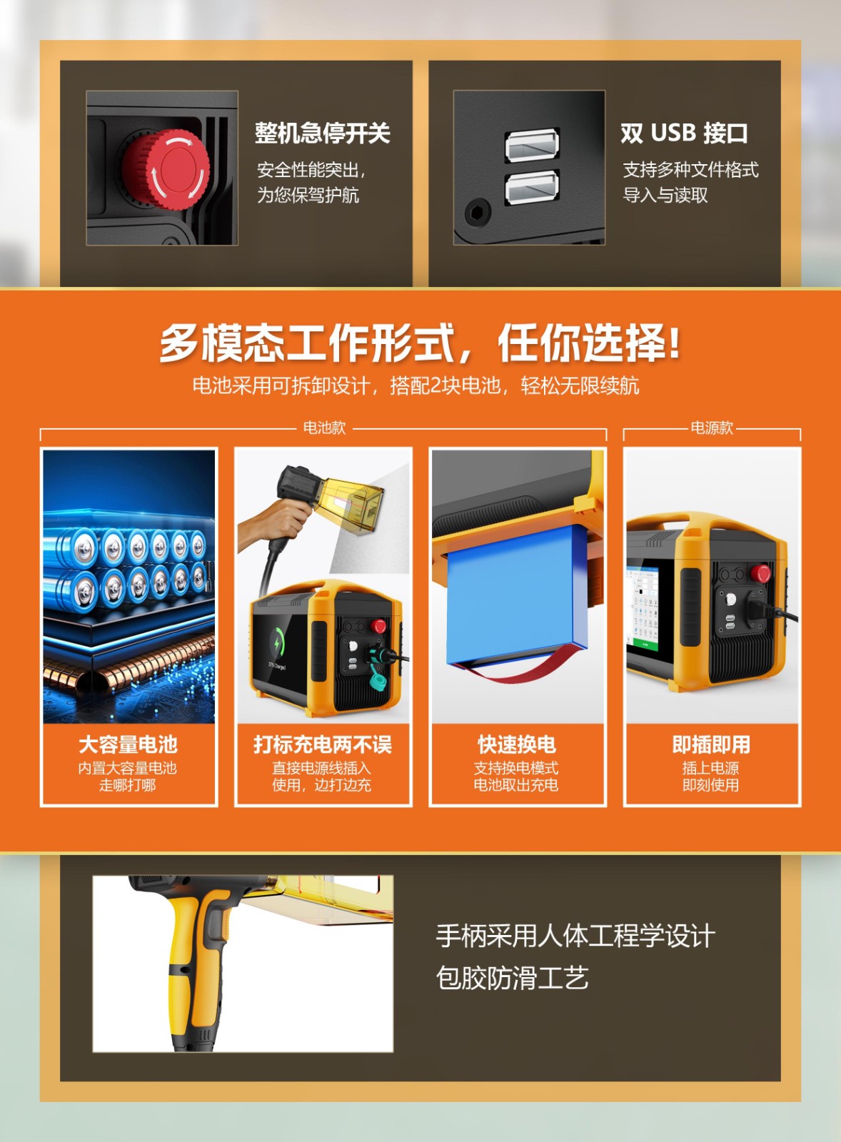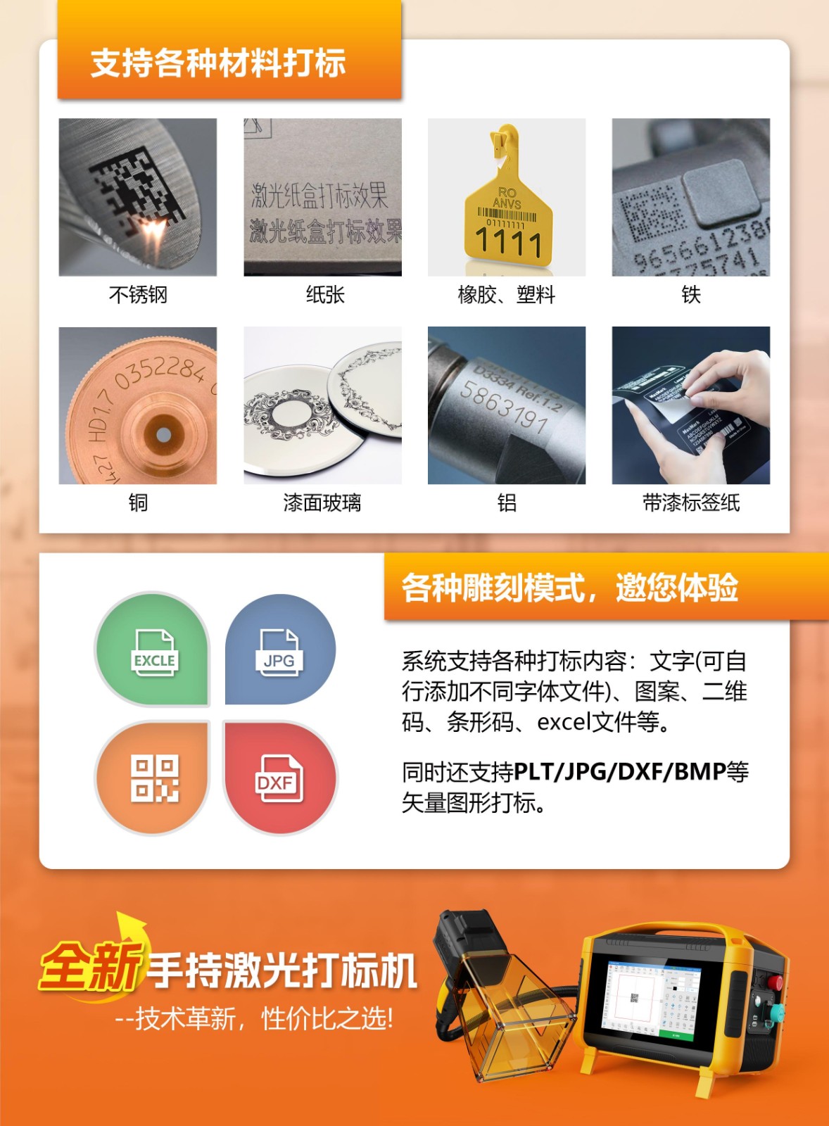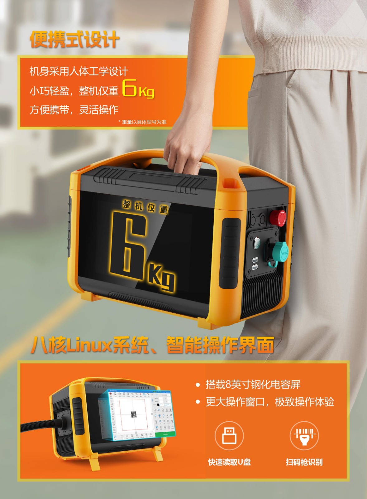20w 30w手持激光打標(biāo)機(jī),機(jī)身采用人體工學(xué)設(shè)計小巧輕盈,整機(jī)僅重6KG,方便攜帶,靈活操作。八核Linux系統(tǒng),搭載8寸鋼化dianzo電容屏,智能操作界面。